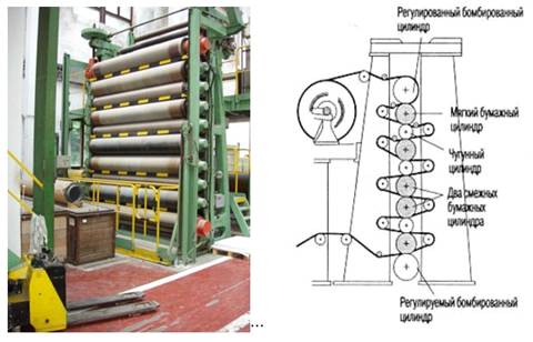 Каландирование осуществляется на машинных каландрах, устанавливаемых в конце сушильной части или на отдельно стоящих суперкаландрах.