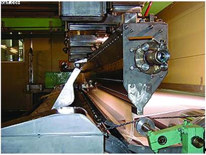 Дозирование пасты завершается до момента ее контакта с полотном, благодаря чему равномерность толщины слоя не зависит от неровностей поверхности полотна-основы. В результате обеспечивается высокая степень равномерности покрытия полотна в машинном и поперечном направлении, а отсутствие механических деталей, соприкасающихся с полотном, снижает требования к прочности бумажного полотна и уменьшает количество обрывов. [5]