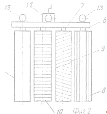 Зазор между валиками и подающим транспортером 3 регулируется с помощью винтовой передачи 12, с помощью которой механизм пластования может перемещаться в вертикальном направлении по направляющим 13. Все валики вращаются в сторону движения ленты транспортера 2 так, что линейная скорость наружной поверхности велика, имеющего минимальный диаметр, равна линейной скорости движения ленты транспортера.