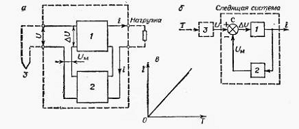 Из структурной схемы преобразователя (рис 1, б) видно, что он представляет собой следящую систему. В прямой цепи этой системы включен усилитель напряжения 1, во входной цепи которого производится вычитание сигналов U и Uм. Следовательно, входная цепь усилителя выполняет функцию сумматора С.В цепь обратной связи включен блок линеаризации 2, преобразующий выходной ток i в напряжение обратной связи Uм.