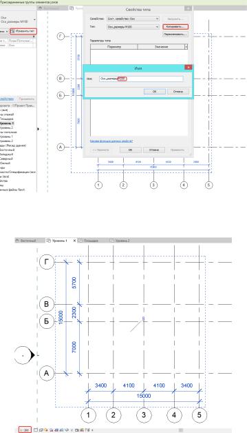 Затем, выделив группу «Оси_размеры М100», нажимаем в «Свойствах группы» на «Изменить тип», затем «Копировать» и создаем группу «Оси_размеры М200».
