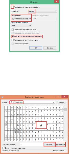 Редактируем верхнюю метку: в параметрах метки в поле «Префикс» вставляем из таблицы символов Windows символ «±» копированием. Выбираем шрифт GOST Common, нужный символ, далее кнопку «Выбрать» и «Копировать».