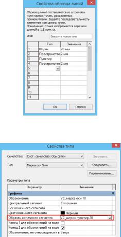 В проекте выбираем ось и в свойствах, изменить тип, в обозначении выбираем наше созданное семейство «VC_марка оси_10». Обозначения осей автоматически изменятся.