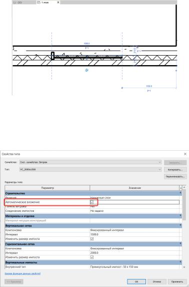 Так как витраж – это тоже элемент стены, нам нужно настроить автоматическое вложение этого элемента. Для этого выделим витраж, «Изменить тип» и ставим галочку в строке свойств «Автоматическое вложение».