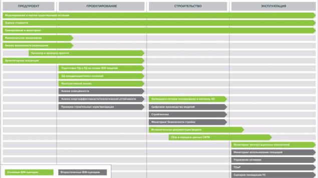 Все этапы жизненного цикла проекта можно кратко представить в виде четырех крупных блоков, на каждом из которых выполняются определенные BIM-сценарии (основные и второстепенные) (рис. 8).
