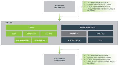 Следует также отметить этапы создания информации в проекте. Так, вначале возникает «Потребность» (Employer’s Information Recurements – EIR), или информационные требования заказчика. Согласно представленным требованиям производится закупка услуг по созданию модели, и создание модели начинается с этапа «Выполнение» (BIM Execution Plan – BEP), после которого происходит заключение контракта и этап «Поставка» (Master Information Delivery Plan – MIDP), после которого происходит подготовка проекта в среде общих данных с участием заказчика. В дальнейшем возможна передача полученной модели для обслуживания и эксплуатации здания (PAS 1192-3). Периодическая оценка проекта сообщает о необходимости реконструкции/реновации объекта или его ликвидации и сносе. И на этих этапах также применяется созданная информационная модель.