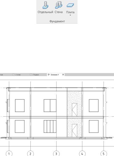 Программа позволяет построить отдельный фундамент под колонны, ленточный, путем задания системного семейства или фундаментную плиту. Инструменты располагаются во вкладке «Конструкция», поле «Фундамент».