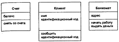 В операции снятия денег через банкомат участвуют 3 объекта: "клиент Иванов", "банкомат на Тверской" и "счет № 66579801″, который открыт в данном банке для Иванова. Подойдя к банкомату и засунув свою карточку, объект "клиент Иванов" посылает банкомату сообщение "Начать работу". Получив такое сообщение, банкомат выводит на экран какую-нибудь информацию и запрашивает код доступа, т.е объект "банкомат на Тверской" посылает сообщение объекту "клиент Иванов" - "Сообщить идентификационный код". Если идентификация прошла успешно, "клиент Иванов" просит выдать ему 1000 рублей. Он посылает сообщение об этом банкомату, а тот в свою очередь объекту "счет № 66579801″. Приняв это сообщение объект "счет № 66579801″ проверяет есть ли у него 1000 рублей, и, если есть, пересылает разрешение на снятие денег, одновременно уменьшая свой баланс на соответствующую сумму. Банкомат передает деньги и на этом процедура заканчивается.