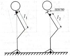 Кроме того, это положение имеет еще одно преимущество: снижается нагрузка на мышцы спины за счет уменьшения момента вращения (или иначе - длины "плеча") штанги, поскольку l2 < l1.