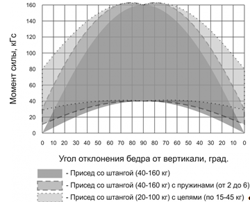 Несколько другая динамика момента силы тяжести наблюдается при использовании цепей, закрепленных на грифе штанги. Если в начальной точке движения (стойка) вес грифа с цепями будет равен весу классической штанги, то в нижнем положении тела (присед) он будет меньше веса классической штанги за счет опускания части звеньев цепей на помост. Следовательно, величина отягощения уменьшается по мере опускания снаряда и возвращается к исходной по мере его подъема.