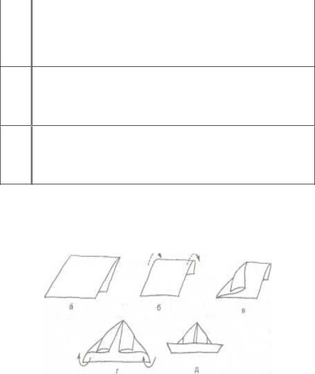 а- складывание пеленки вдвое по длине, б - подвертывание сложенного края пеленки, в - сдвижение верхнего края пеленки к центру, г - складывание нижнего края пеленки, д -