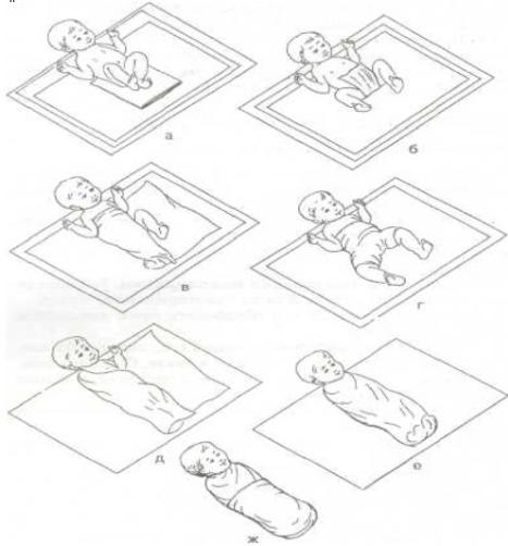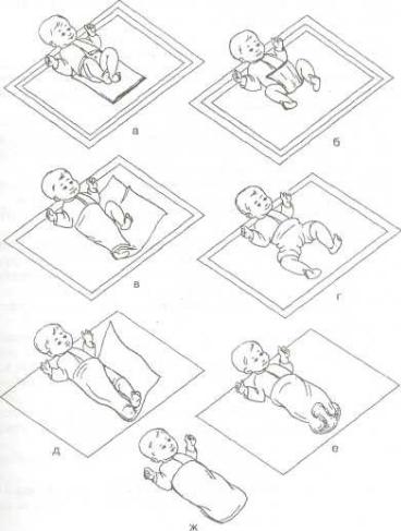 а- последовательность размещения пеленок, б - проведение подгузника между ног ребенка, в, г - фиксация подгузника пеленкой ("штанишками"), д - пеленание туловища и конечностей, е - отделение пеленкой голеней и стоп, ж - фиксация предыдущих слоев наружной пеленкой