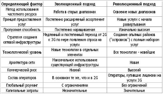 В рамках концепции IMT-2000 допустимы две стратегии перехода к 3G-системам: постепенное (эволюционное) и "одномоментное" (революционное) (таблица 4).