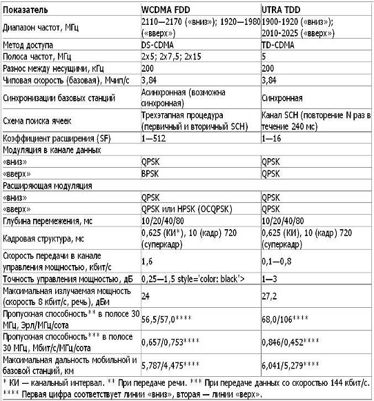 Таблица 6. Сравнительные характеристики систем WCDMA FDD и UTRA TDD