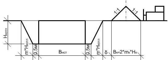 δ - расстояние от края выемки до внутренней бровки кавальера, δ = 3,5 м;к - заложение внутреннего откоса кавальера, mк = 1:1;