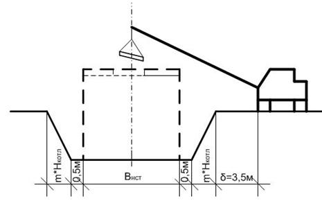 Принимается в зависимости от глубины котлована, типа грунтов (принимаем δ = 3,5 м);- ширина ходовой части крана, для упрощения примем d = 3 м.= (8,5/2) + 3.5 + (3,0/2) = 9,2 м