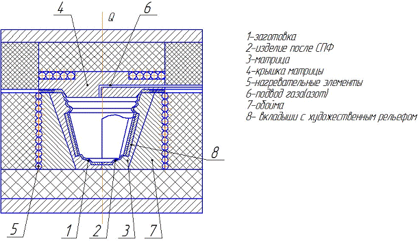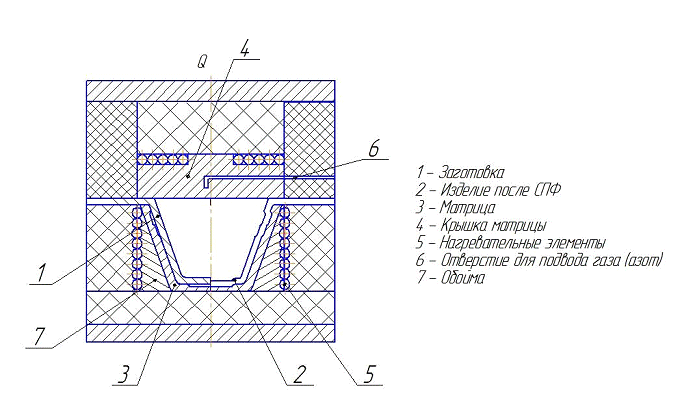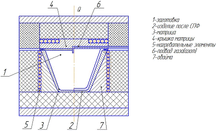 где 1 - заготовка; 2 - - изделие после СПФ; 3 - матрица; 4 - крышка матрицы; 5 - нагревательные элементы; 6 - подвод газа (азот); 7 - обойма;