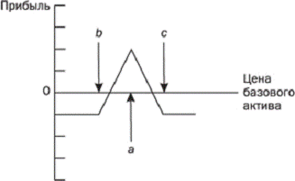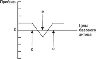 Так, хеджер продает колл-опцион с меньшей ценой исполнения b, покупает два колл-опциона со средней ценой исполнения a и продает колл-опцион с большей ценой исполнения c. Здесь также возможно использование пут-опционов, считающееся, тем не менее, не столь распространенным.