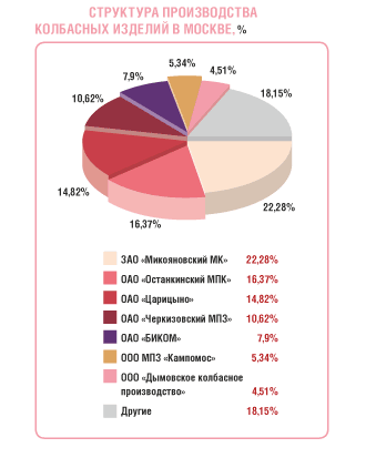 Российский рынок в основном все же представлен в большей степени отечественной продукцией и в меньшей - импортной. По данным некоторых экспертов, доля отечественной продукции в общем объеме рынка колбасных изделий составляет более 97%.