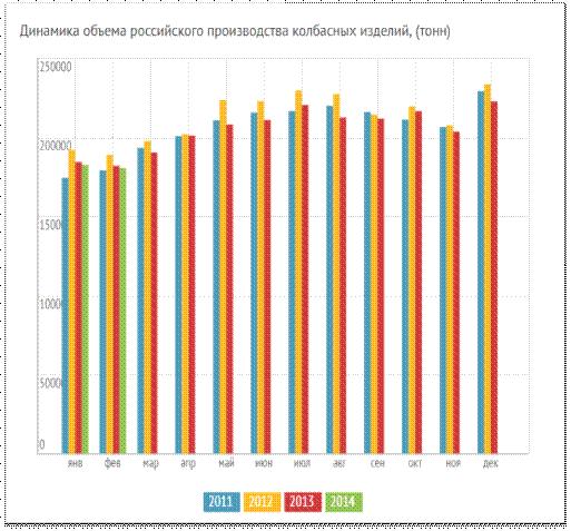 · Производство колбасных изделий в декабре 2013 года уменьшилась на -4,6% к уровню декабря прошлого года и составило 222 648,5 тонн.