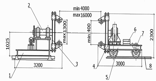 - опорная рама; 2 - вал; 3 - траверса; 4 - подвижная опора; 5 - тележка; 6 - контрольный груз; 7 - электромотор; 8 - рельс