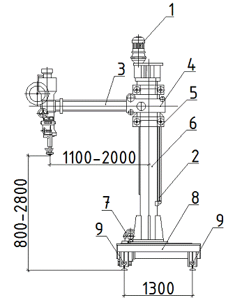 - электродвигатель; 2- ходовой винт; 3- консоль; 4- направляющая; 5- каретка; 6- стойка; 7- электродвигатель механизма передвижения тележки; 8- платформа; 9- рельс;