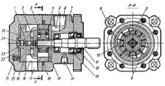 Насос состоит: отверстие для подвода высокого давления жидкости, отверстие в заднем диске, ротор насоса, передний диск, кольцевой канал, подводящее входное отверстие, корпус насоса, статор, лопость-лопатка, отверстие, вал, манжет, шариковые подшипники, дренажное отверстие, полости на лопастях, уплотнительное кольцо, сливное отверстие, сливная полость, кольцевой выступ, крышка, пружина, золотник, задний диск, коробка, полость.