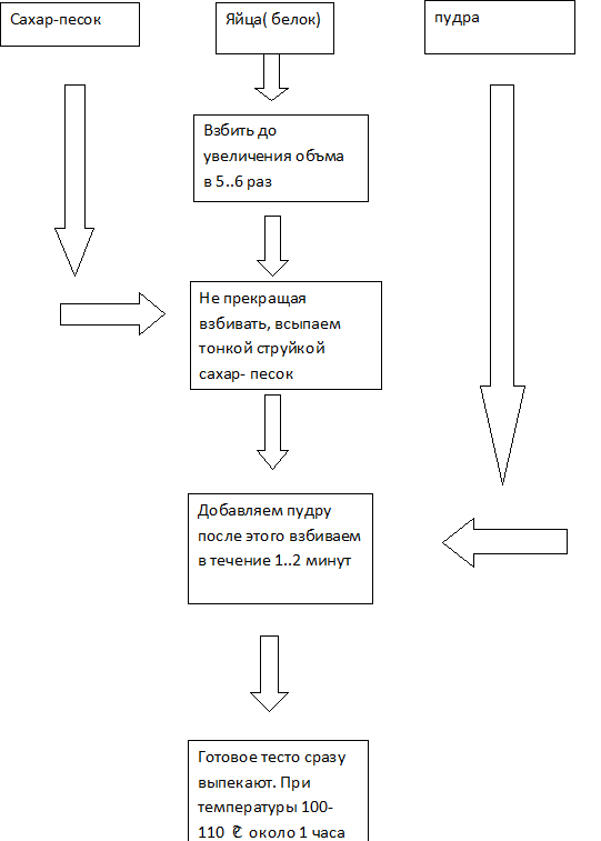 Яичные белки взбивают до увеличения их объема в 5..6 раз и до образования стойкой пены. Не прекращения взбивания, тонкой струей постоянно всыпают сахар-песок, добавляют пудру и после этого взбивают в течение 1..2 мин, не боле. Если взбивать дольше, то масса может уменьшиться в объеме и осесть. Она должна быть пышной и сухой на вид. Готовое тесто сразу выпекают в виде лепешки на кондитерских листах для тортов круглой или прямоугольной формы, используя для этой цели железные рамы или кольца определенного размера. Кондитерские листы смазывают маслом подпыливают мукой, ставят на них раму или кольцо, наполняют слой теста толщиной 8..10 мм, выравнивают ножом и выпекают при температуре 100… 110º С около 1 час.