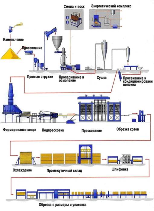 Сырье подается в производство в виде кондиционной щепы. Подготовка сырья к производству плит, состоящая в приготовлении кондиционной щепы, включает следующие операции: разделку древесины на размеры, соответствующие приемному патрону рубительной машины; рубку древесины на щепу; сортировку щепы для отбора требуемого размера с доизмельчением крупной фракции и удалением мелочи; извлечение из щепы металлических предметов; промывку щепы для очистки ее от грязи и посторонних включений.