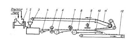 тестовальцующая машина, 6- транспортер, 7- щетка, 8- транспортер, 9- штамп, 10-
