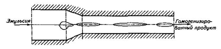 При падении давления ниже давления насыщенных паров жидкость вскипает. При последующем повышении давления пузырьки паров "схлопываются". Генерируемые при этом высокоинтенсивные, но маломасштабные пульсации давления и скорости среды гомогенизируют ее.