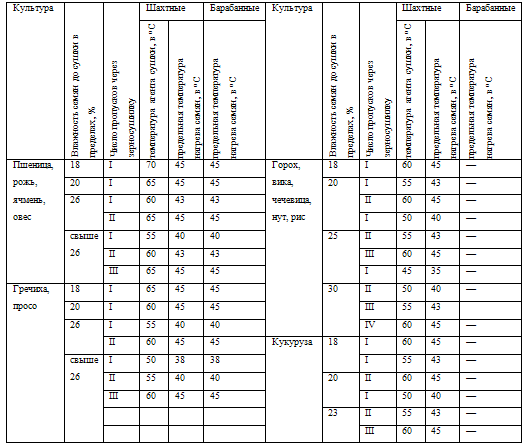 Предельно допустимая температура нагрева зерна и семян зависит от: 1) культуры; 2) характера использования зерна и семян в дальнейшем (т. е. целевого назначения); 3) исходной влажности зерна и семян, т. е. влажности их до сушки.