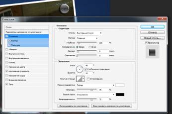 помощью закладки «Тиснение» и её подпунктов «Контур» и «Текстура»: