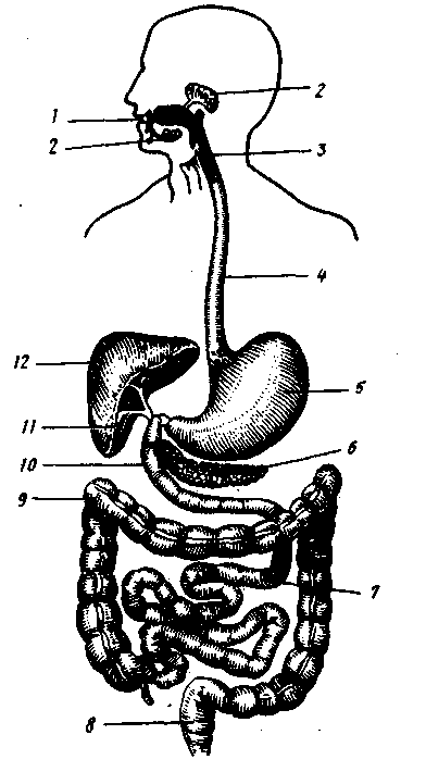 1 — ротовая полость, 2 — слюнные железы (подчелюстная и околоушная), 3 — глотка, 4 — пищевод, 3 — желудок, 6 — поджелудочная железа, 7 — тонкая кишка, 8 — прямая кишка, 9 — толстая кишка, 10 — двенадцатиперстная кишка, 11 — жёлчный пузырь, 12 — печень |