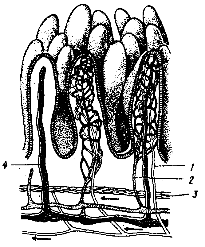 Рис. 2 Строение кишечной ворсинки: 1 — артерия, 2 — вена, 3 — гладкие мышцы, 4 — центральный лимфатический сосуд; стрелками показано направление тока крови |