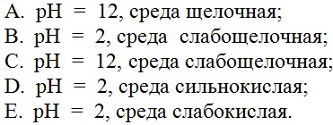 Концентрация ионов гидроксила в исследуемом растворе равна 1·10-12 моль/л. Укажите рН раствора и характер среды.