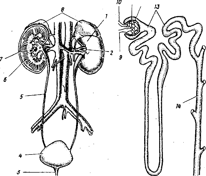 Рис. 1. Выделительная система. А — органы выделения; Б — строение нефрона: 1 — почка, 2 — ворота почки, 3 — мочеиспускательный канал, 4 — мочевой пузырь, 5 — мочеточник, 6 — мозговой слой, 7 — корковый слой, 8 — надпочечники, 9,10 — приносящая и выносящая артерии, 11 — сосудистый клубочек, 12 — капсула, 13 — извитой каналец, 14 — собирательная трубочка |