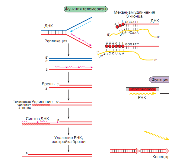 Существует фермент теломераза, добавляющий особые повторяющиеся последовательности ДНК (TTAGGG у позвоночных) к 3'-концу цепи ДНК на участках теломер. Протяженность таких блоков у человека составляет 5-15 kilobases