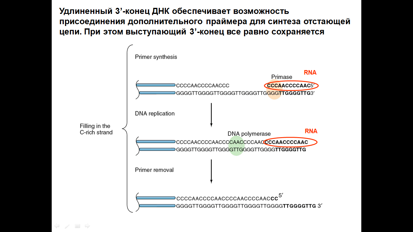 ◄При воспроизведении перед клеточным делением синтез ДНК начинается с затравки РНК, затравка затем удаляется, бреши застраиваются. Однако на одном из концов реплицирующихся молекул остается брешь, которую не удается заделать ДНК полимеразе, работающей в 5’-3’ направлении. Возникает опасность, что одиночно выступающий фрагмент ДНК будет уничтожен каким либо ферментом, и при каждом акте репликации молекула будет укорачиваться с конца.