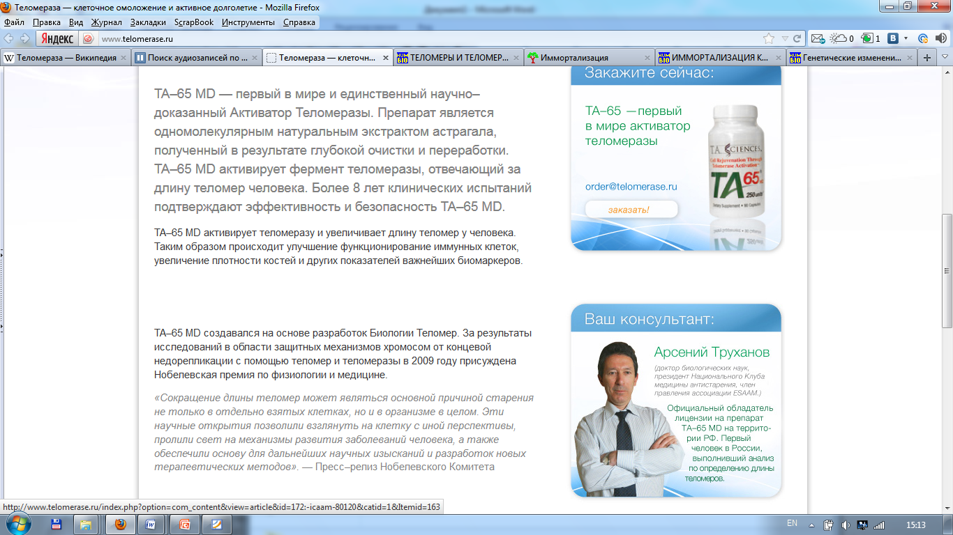 И, главное, из этих клеток не развиваются опухоли при трансплантации бестимусным мышам. Полученные данные свидетельствуют о том, что экспрессия теломеразы в культуре клеток человека совсем не обязательно вызывает развитие рака, т.е. теломераза лишена свойств онкогена.