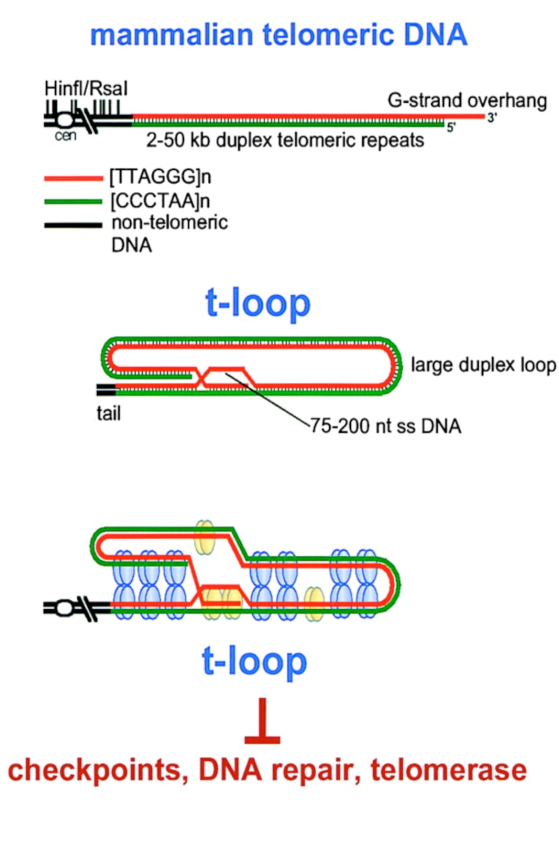 Теломераза является обратной транскриптазой ( РНК-зависимая ДНК-полимераза), причём с ней связана особая молекула РНК, которая используется в качестве матрицы для обратной транскрипции во время удлинения теломер. Особые белки связываются с теломерными повторами- TRF1 & TRF - это предотвращает слияние хромосом (посредством рекомбинации)