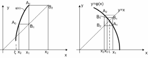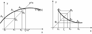 Нетрудно видеть, что в первом случае для производной выполняется условие 0< j’(x)< 1, а во втором случае производная j’(x)<0 и j’(x)>-1. Таким образом, очевидно, что если |j’(x)|<1, то процесс итераций сходится к корню.