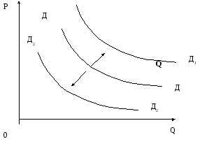 Изменение величины спроса не надо путать с понятием изменении в спросе. Изменение величины спроса происходит под влиянием изменения только одного фактора цены, все остальные остаются неизменными. При снижении цены объем спроса увеличивается (движение линии спроса вправо и вниз), а при движении влево вверх объем спроса падает с увеличением цены. Скольжение происходит вдоль одной и той же линии спроса. При изменении хотя бы одного нецелого фактора (например, дохода) произойдут изменения в спросе, то каждой возможной цене товара будет соответствовать больший объем спроса (предполагая, что вкусы и предпочтение не изменились). В этом случае произойдет сдвиг линии спроса вправо из положения ДД в положение Д1Д1 и напротив уменьшение дохода у населения приведет к смещению линии спроса влево в положение Д2Д2. В этих случаях речь идет об изменении спроса.