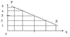 Под спросом понимают количество товаров, которые потребители готовы и в состоянии купить по определенным ценам за его единицу в течении определенного периода. В основе спроса лежат потребности потребителя, которые определяют желание покупателя. Желание лимитируется располагаемой суммой денег. Связь между ценой и количеством покупаемого товара устойчивая, постоянно повторяющая и имеет характерную направленность, определяемую как закон спроса, который гласит: что при прочих равных условиях снижение цены ведет к повышению величины спроса, а рост цены – к снижению спроса. Изобразим это графически. На оси ординат отложим значение цены (Р), а на оси абсцисс – количество (объем) товара Q.