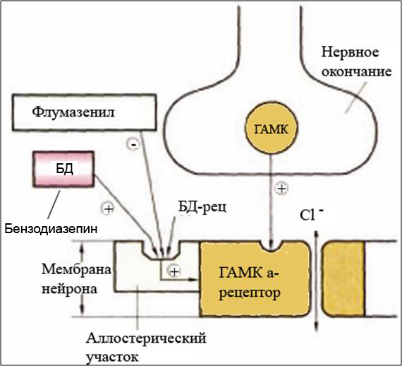 Рассмотрите схему «Локализация действия анксиолитиков бензодиазепинового ряда и их антагониста флумазенила.
