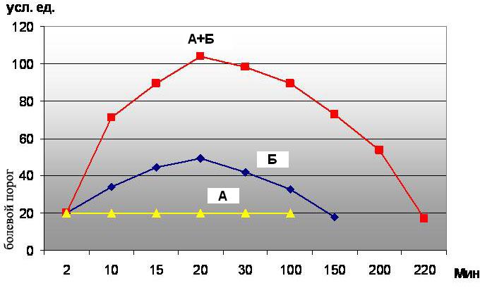 Оцените влияние дроперидола (А) на обезболивающий эффект фентанила (Б).
