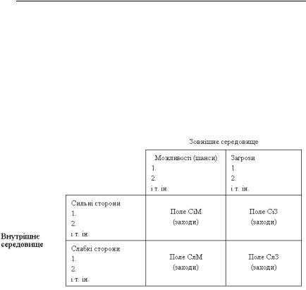 Простежити співвідношення факторів зовнішнього та внутрішнього середовища, що трактується в категоріях SWOT-аналізу, можна за до- помогою певної матриці (рис. 4.3).