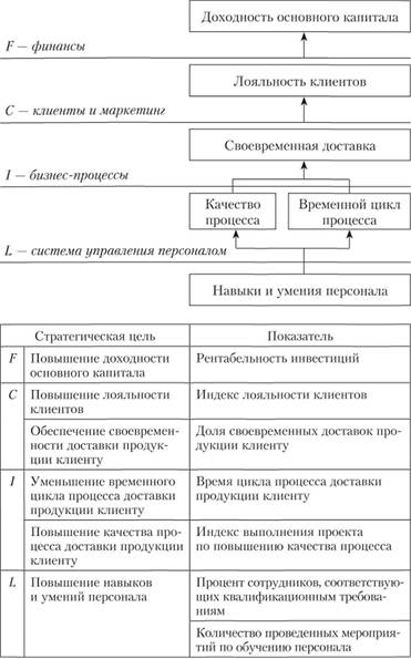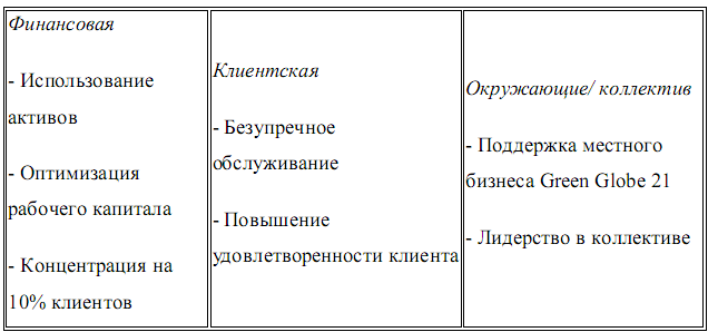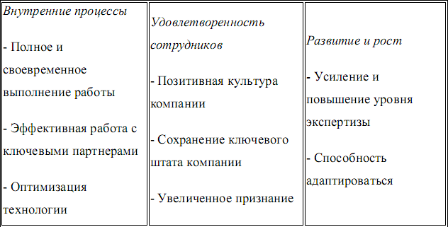 При разработке концепции управления по ключевым показателям эффективности рекомендуется ограничивать количество основных показателей счетной карты одного уровня управления в интересах достижения сбалансированности и непротиворечивости (как правило, их число не должно превышать 15–20). Кроме того, требуется отказаться от использования только финансовых показателей для оценки эффективности деятельности компании и сконцентрироваться на показателях нефинансового характера, оценивающих удовлетворенность потребителей, эффективность технологических и управленческих процессов, потенциал обслуживающего персонала, которые, по сути, обеспечивают финансовый успех компании.