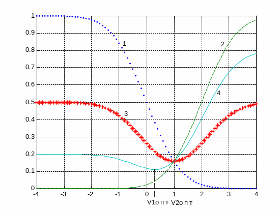 Пороговое напряжение, при котором средняя вероятность ошибки минимальна, называется оптимальным пороговым напряжением Vопт . Оптимальное значение порогового напряжения может быть найдено как решение уравнения: