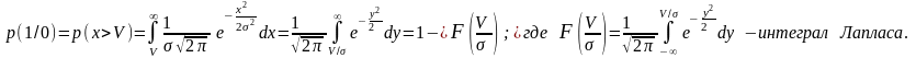 Рассчитаем зависимость р(1/0) и р(0/1) от порогового напряжения V, если шум x(t), поражающий сигнал – нормальный. Вероятность p(1/0) равна вероятности p(z(t)>V) и равна вероятности p(x(t)>V), т.к. при передаче 0 процесс z(t)=x(t). Так как ФПВ помехи x(t) – гауссова с дисперсией σ2 , т.е.: